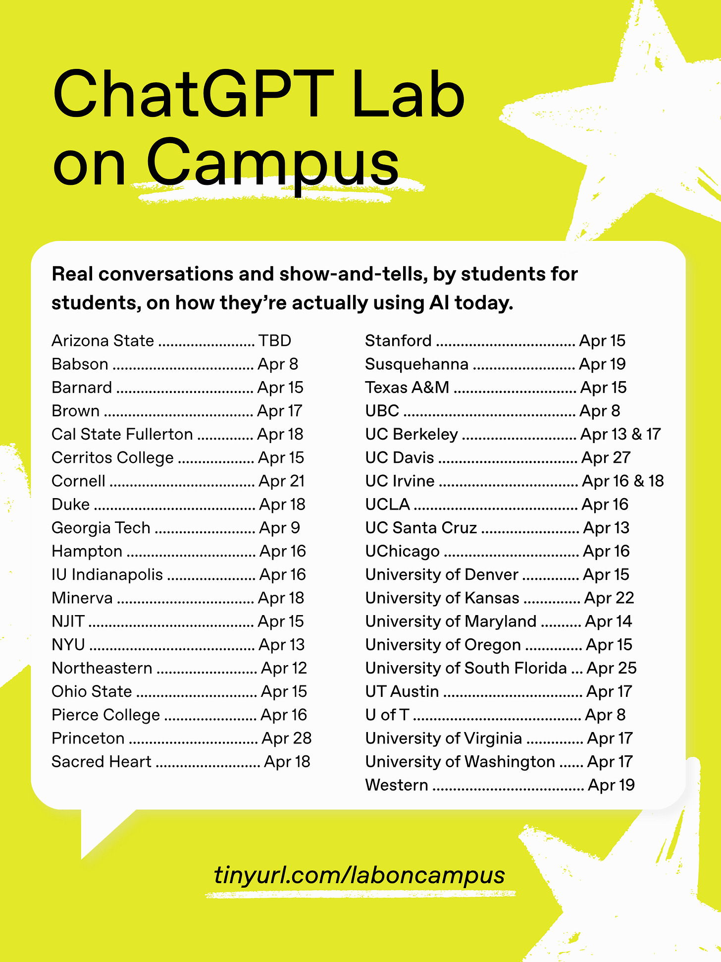 Students are bringing the ChatGPT Lab to 40 campuses in the US and Canada this month. You’re invited!